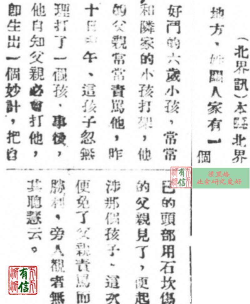 (北界讯)本临近北界的地方,姓关人家有一个很机灵的六岁小孩,常常和邻家的小孩打架。他的父亲常常责骂他。昨十日中午,这孩子忽然无理打了一个孩,事后,他自知父亲必会打他,即想出一个妙计,把自己的头部用石坎(磕)伤,他的父亲见了,便起来干涉那个孩子。这次,他免受了父亲的责骂还占了胜利,旁人观者无不称其聪慧云(旁边观看的人没有不称赞他聪明的)。